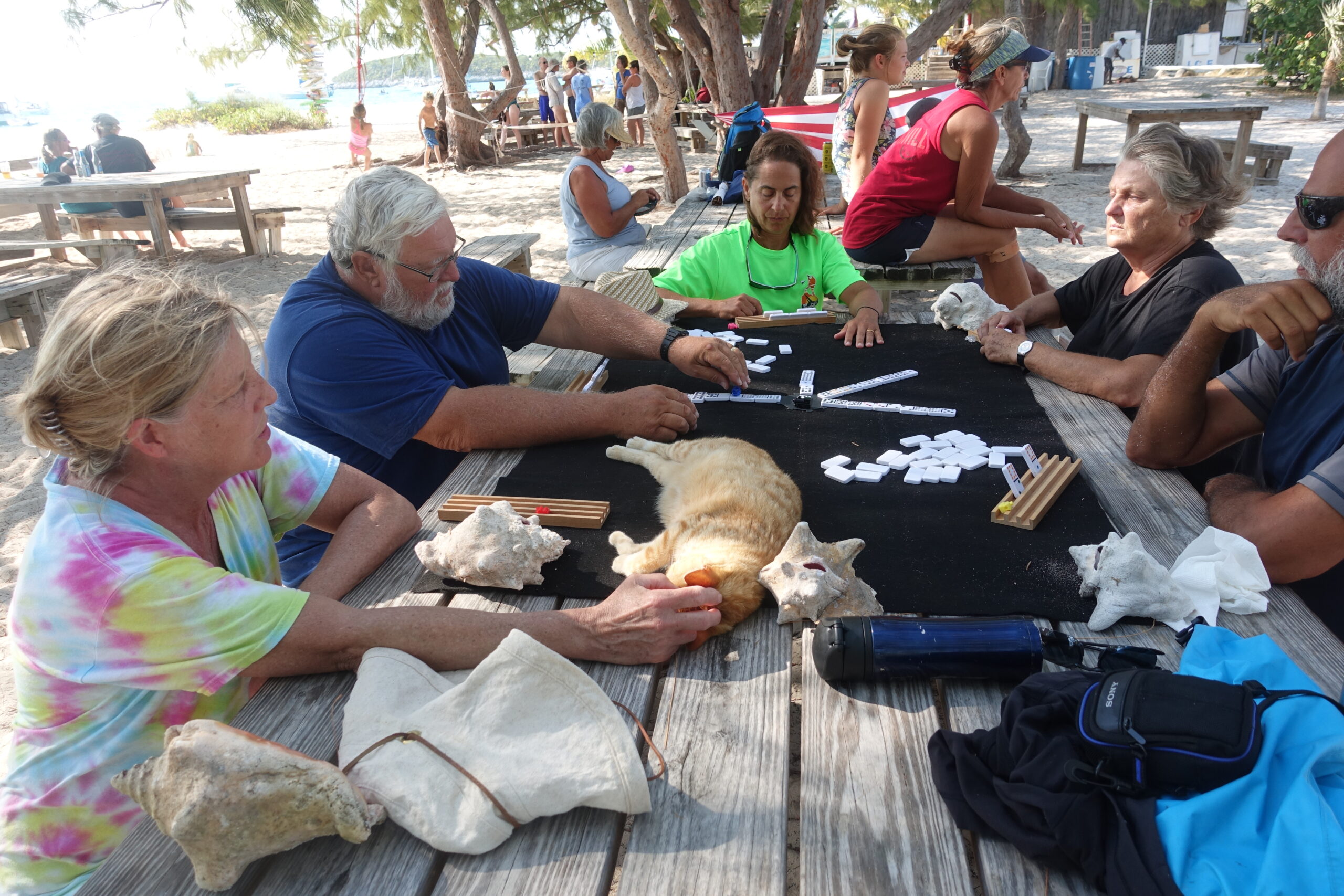I finally experienced summer camp as truly Georgetown, Great Exhuma upholds that reputation. Don and I played Texas Hold ‘Em led by Nicky and Richard Pendergast at least 2x a week; I went to water aerobics almost daily led by Cal from Sailacat Charters and later Elsa Gustafson. Don played volleyball in the afternoons, while we both played Mexican Train dominos led by Dana Pichon. We took walks along the trails maintained by fellow cruisers, snorkeled with new friends, danced Wednesday nights at the Chat and Chill, and unsuccessfully hunted lobster. We made many friends for life; and hope to see them as we continue our adventure.