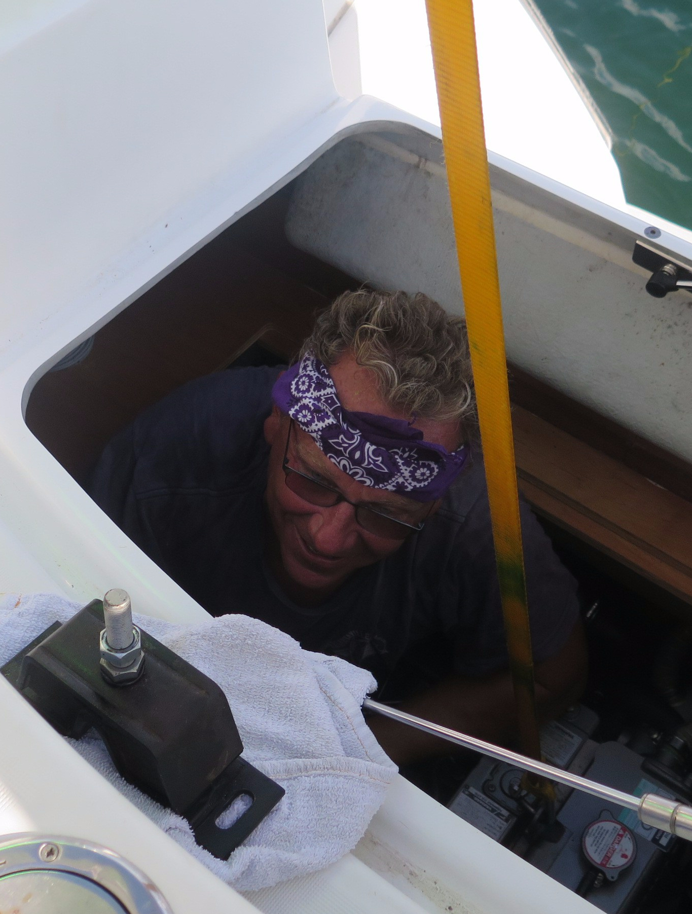 So there we were, hanging out in the anchorage, and our friends Sally and John Mccartney from S/V Latitude Adjustment came by for a visit. We were showing them around the boat, and having a similar boat, after seeing the interior, John was interested in seeing the engines. Good luck for us that he did. After complimenting us on having sparkly clean engine compartments, (All Nina’s doing), we took a look in the second engine compartment. There in the bilge, we spotted a bolt (or what looked like a bolt). As I pulled it out, John remarked “I know exactly what that is!!” That was good to hear — or was it?